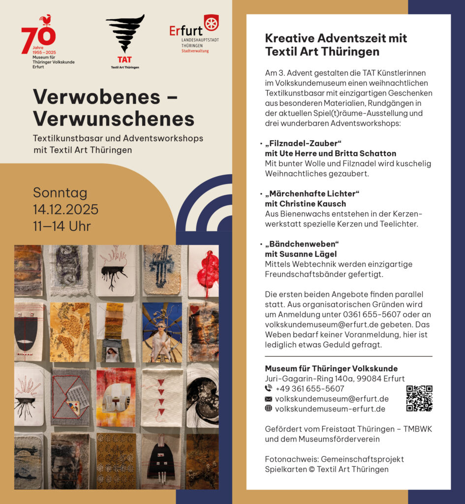Das Team des Museums für Thüringer Volkskunde in Verbindung den Künstlerinnen der TAT Textil Art Thüringen lädt herzlich zum weihnachtlichen TAT-Textilkunstbasar ein, der Ihnen die Möglichkeit öffnet, kurz vor dem Fest einzigartige Geschenke zu erwerben.
